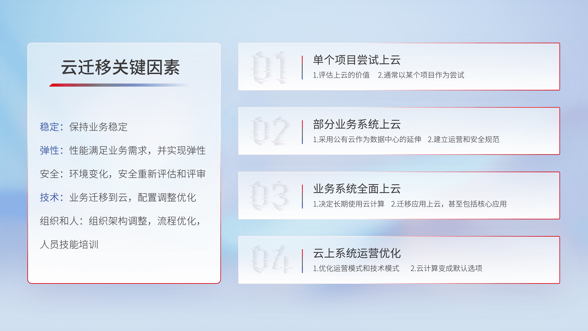 结合实际业务,,,,从规划设计、、、、云平台选型、、、云原生改造、、、、数据迁移、、、、集成交付,,迁移全过程为客户识别最佳上云路径,,,,做好风险识别管理,,设计网络架构、、身份权限、、、安全审计合规、、、操作审计、、、日志审计、、、、监控告警策略、、、、多站点容灾设计等,,对云上基础设施进行整体规划,,,,提升IT治理水平,,,以满足弹性、、高可用、、、、高性能的需求。。。