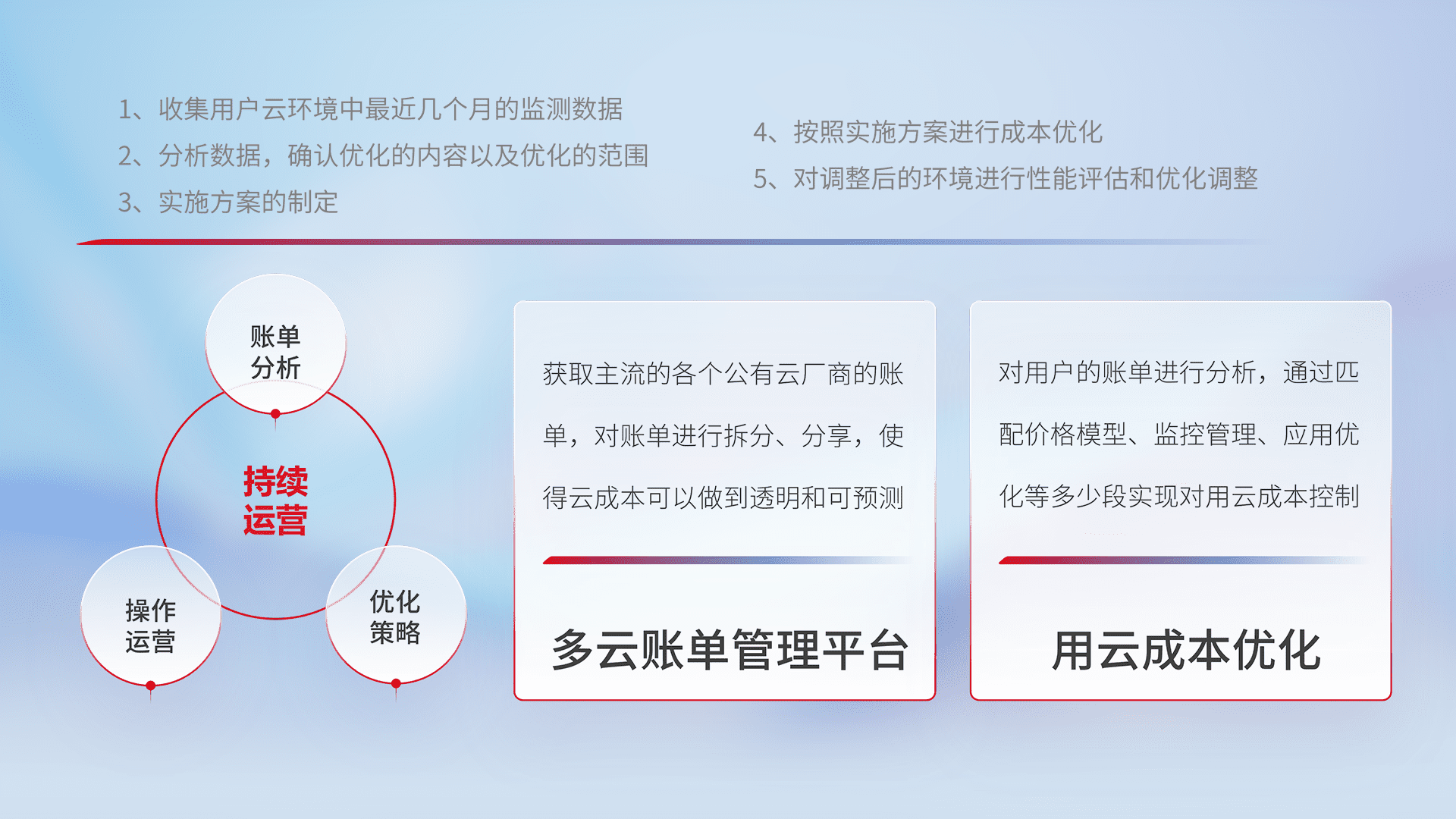 通过多云纳管,,以统一的资源数据模型把客户的云资源进行抽象和封装,,,,进而实现对多云资源的统一操作,,保障云资源管理的可靠性、、、、稳定性与可用性。。量身定制化运维内容,,,,配置、、、开发运维、、、补丁管理、、、、备份、、、、监控、、、认证和访问管理、、、审计和日常巡检等,,保障在用云过程中的可靠度,,,,稳定度以及高可用率。。。。